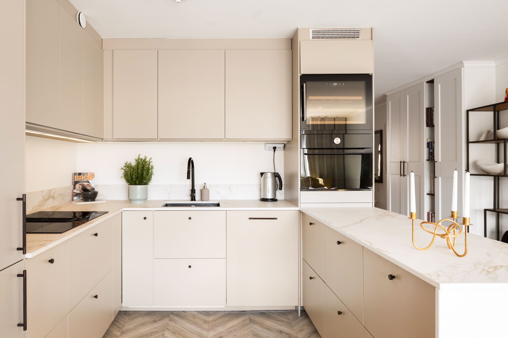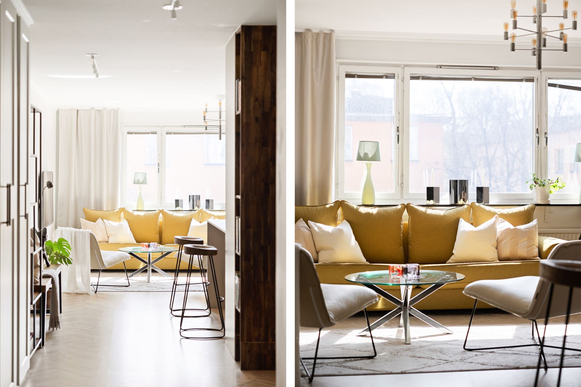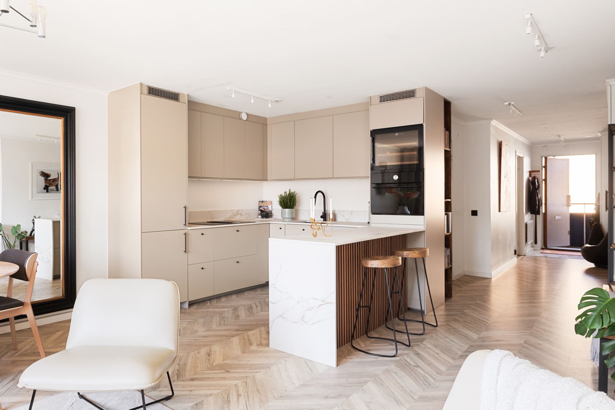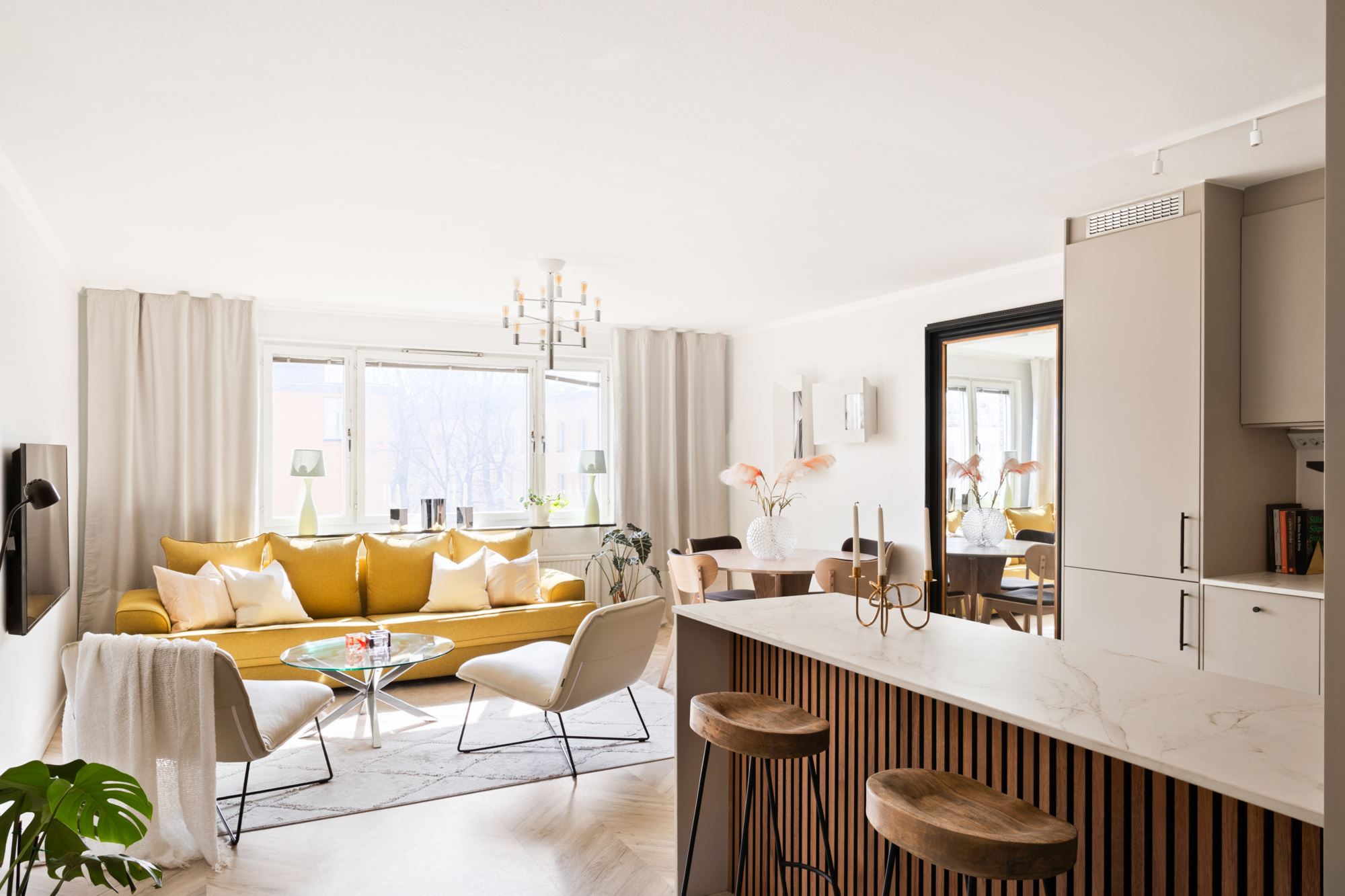 Lägenheten disponeras över ett rymligt vardagsrum med plats för både soffgrupp och matbord – perfekt för såväl avkoppling som sociala tillställningar. Det smakfullt renoverade köket är fullt utrustat med moderna vitvaror, goda arbetsytor och generös förvaring.