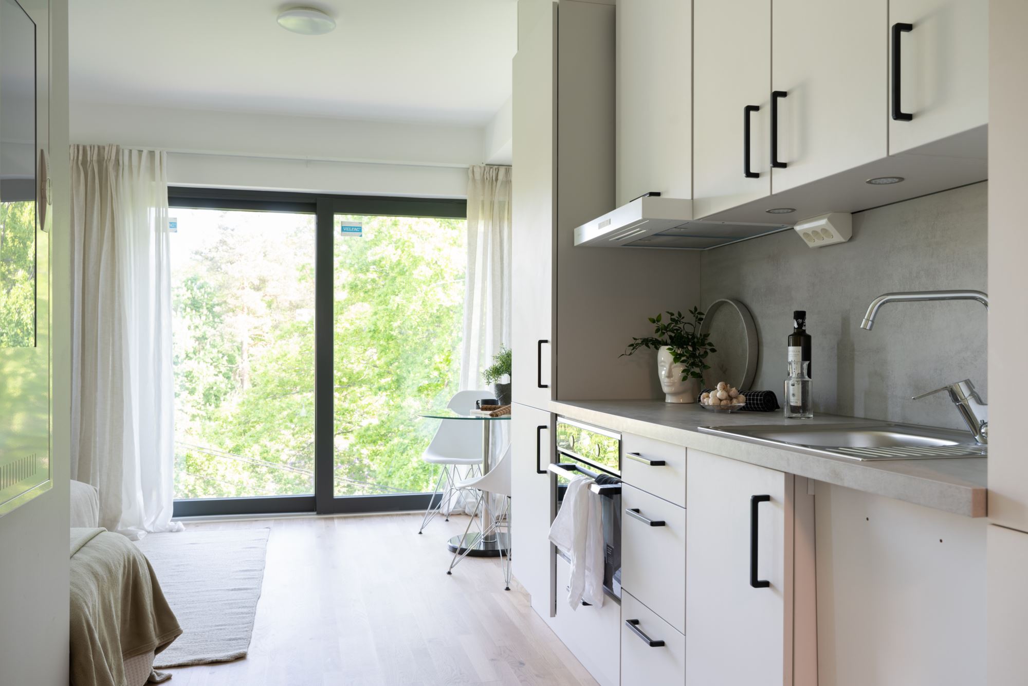 Som tillval kan du välja vår specialdesignade compact living-lösning – en stilren, flexibel inredning som förvandlar din studio till en dynamisk tvåa. Sov, jobba, umgås och lev – allt i samma rum, utan att märka det.