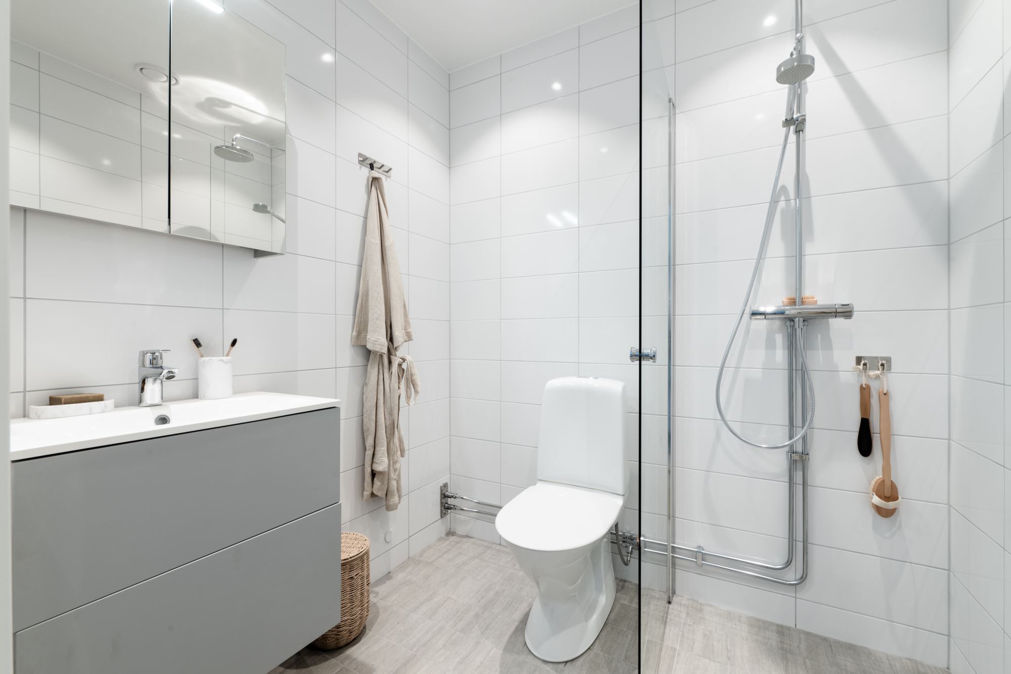 - Helkaklat badrum med golvvärme och dusch, förberett för tvättmaskin