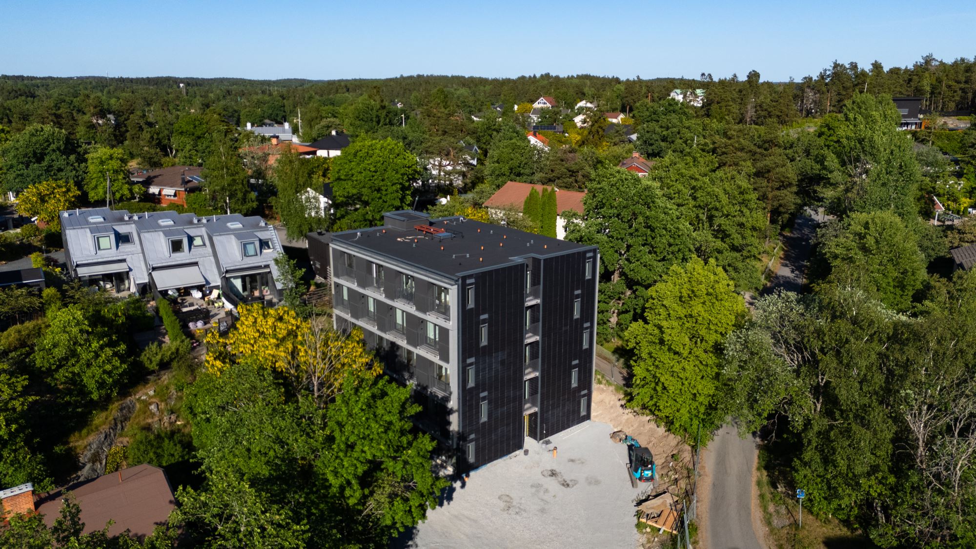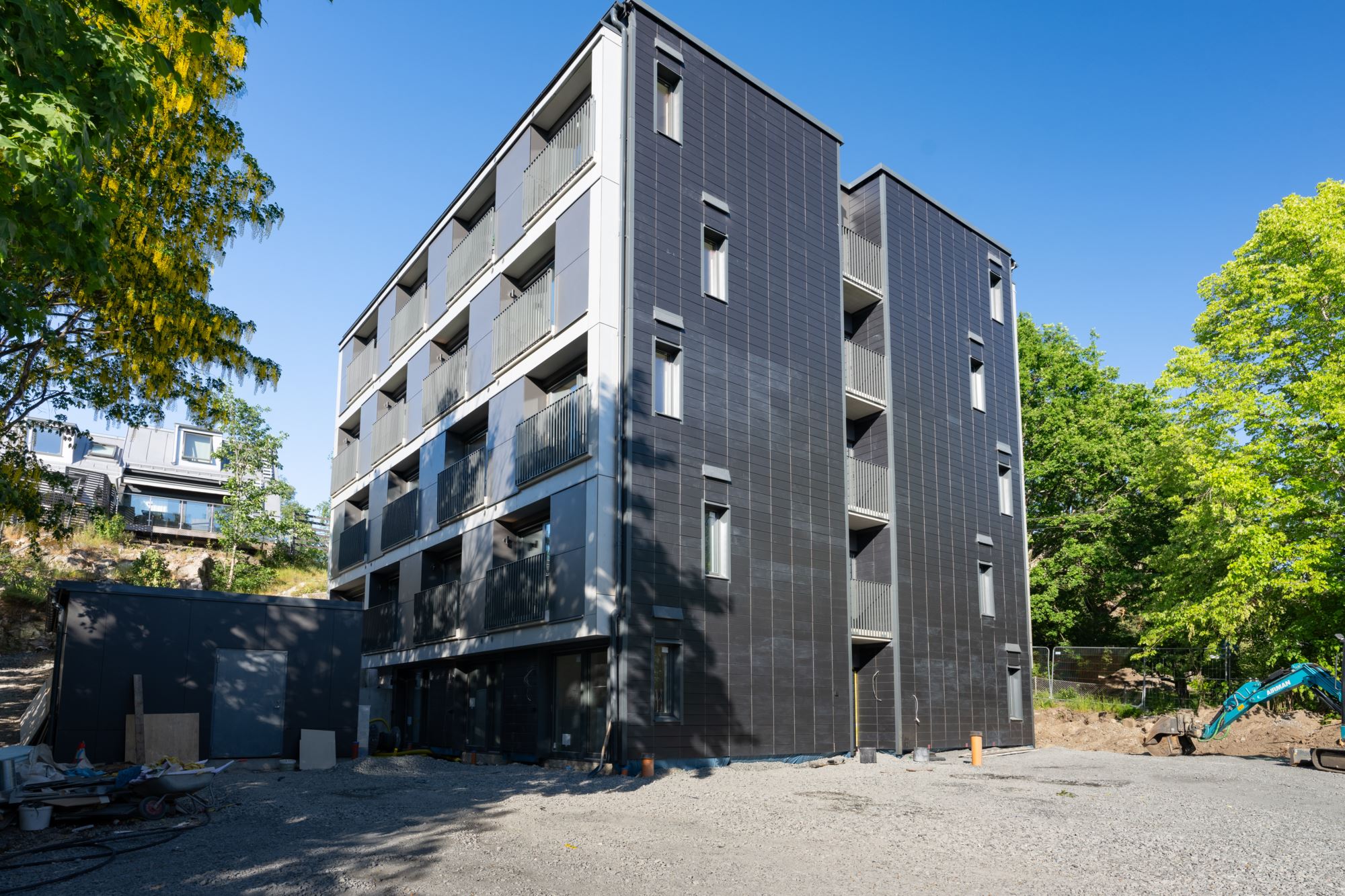 Brf Opalen i Nacka registrerades 2023 och är en äkta förening som äger marken. Den stilfulla fastigheten är byggd i betong i fem våningar med en svart keramisk fasad i skandinavisk design. Den underhållsfria fasaden ger ett mycket exklusivt intryck. Fastigheten rymmer 36 yteffektiva studios om 20-22 kvadratmeter, där varje bostad är genomtänkt för att maximera komfort och funktionalitet.