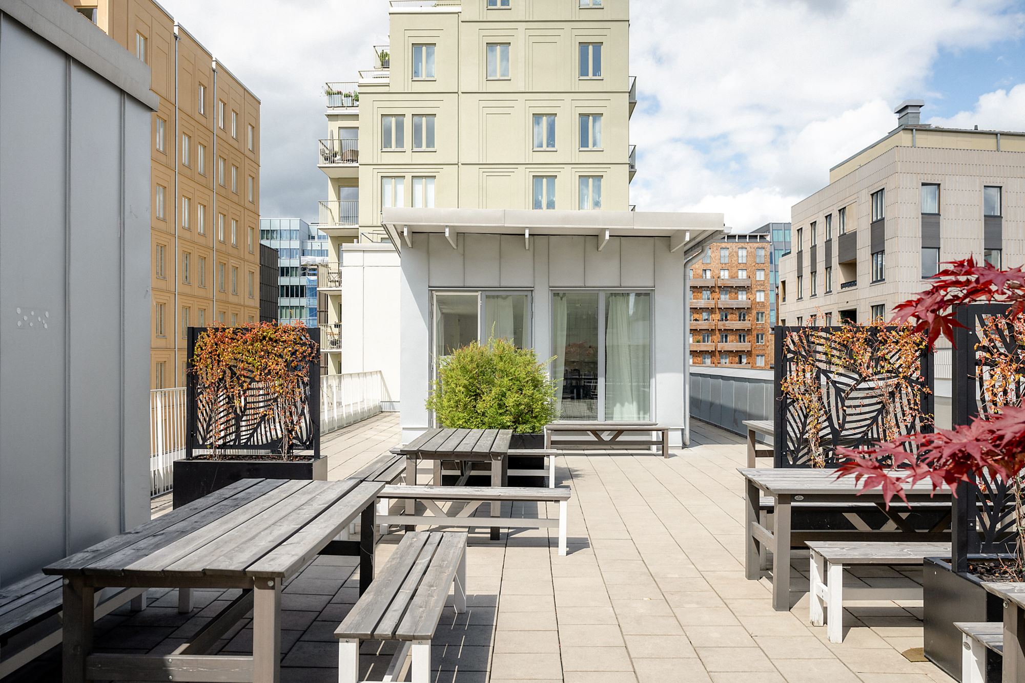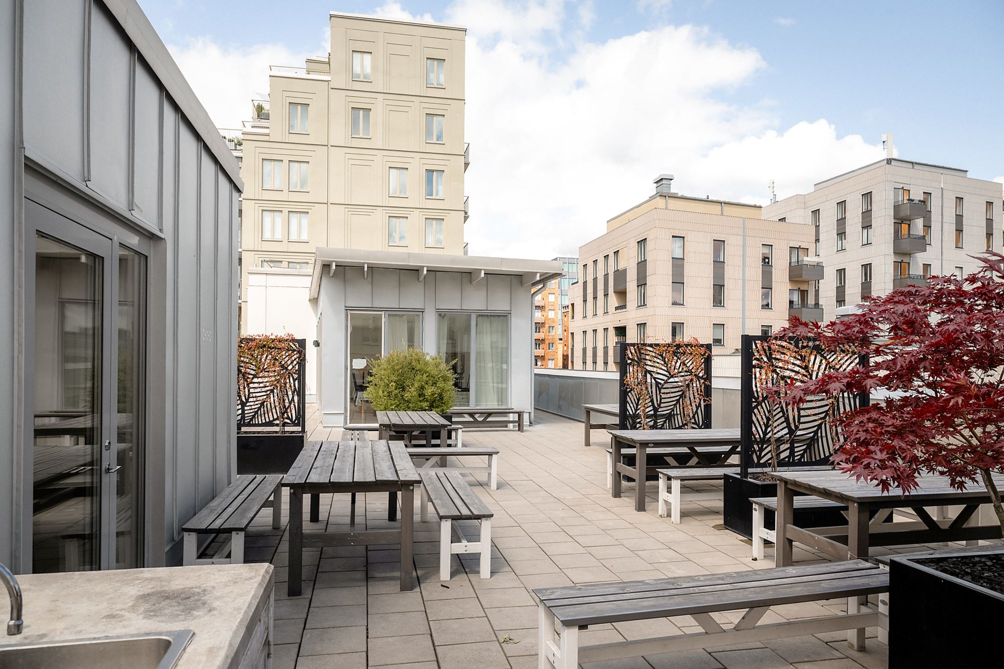 Takterrass gemensam med sittplatser, bord, grill och utekök